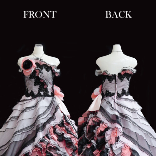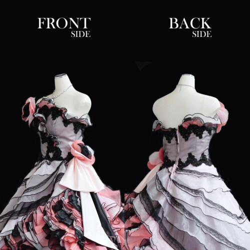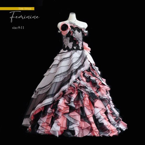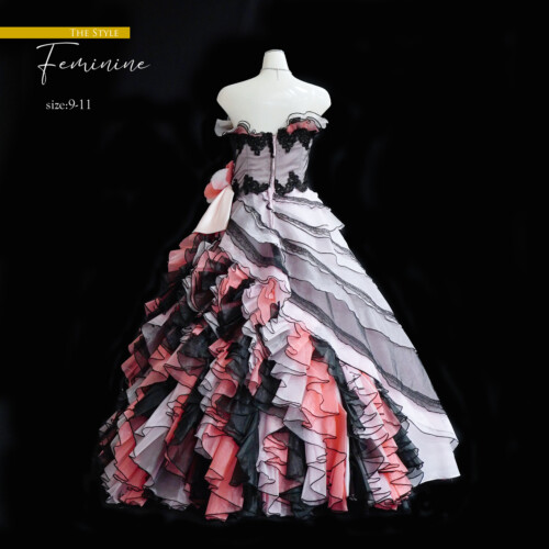 何層にか重なり合わせたピンクカラー、アシンメトリーなスカートのティアードは黒レースを豪華に使用し、ドラマチックな魅力に溢れたドレス。クールな美しさと愛らしさをあわせもつ大人っぽさのイメージさせる一着。