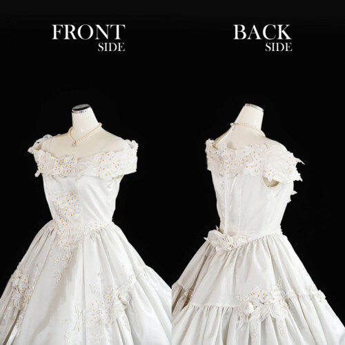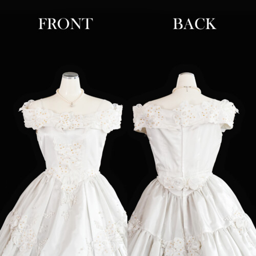 煌びやかに発光するサテン素材にバラの花を模ったアップリケにスパンコールを散りばめかわいらしさ感じるドレス。オフショルダーの王道プリンセスライン。