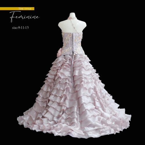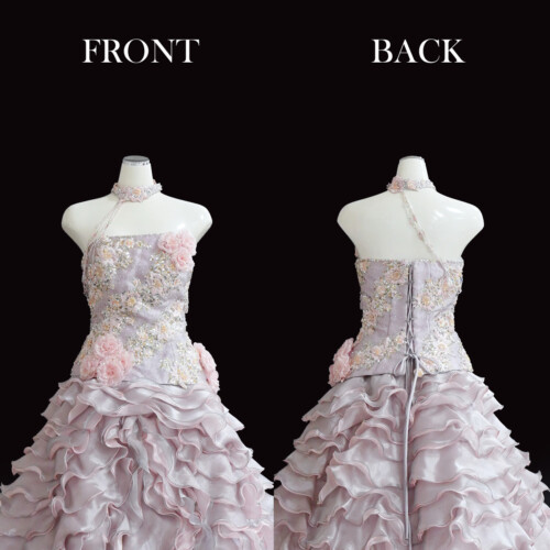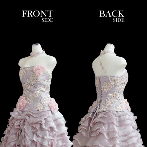 淡いピンクにグレーチュールを合わせてくすみカラーの落ち着き感のあるイメージ。身頃ビーズ加工を施されて豪華さを演出、スカートには波打つ立体的なフリルがふんわりと包み込み、バランスのとれたエレガントなドレス。