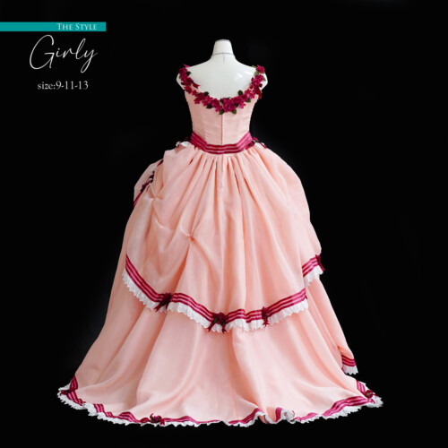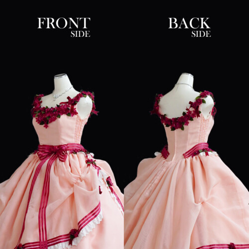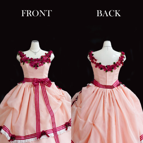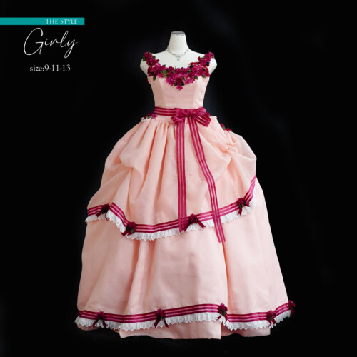 可愛らしさをいっぱい感じるピンクカラードレス。胸元の花の小花のコサージュが優しいい雰囲気を醸し出してくれます。キュートなチェリーピンクカラーのリボンがスタイルアップ効果も感じます。