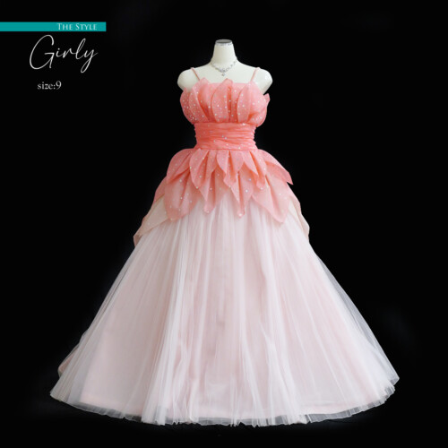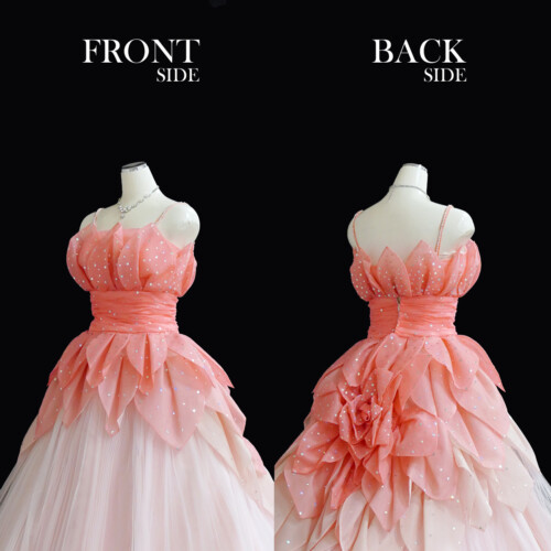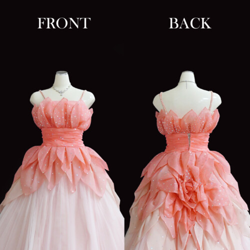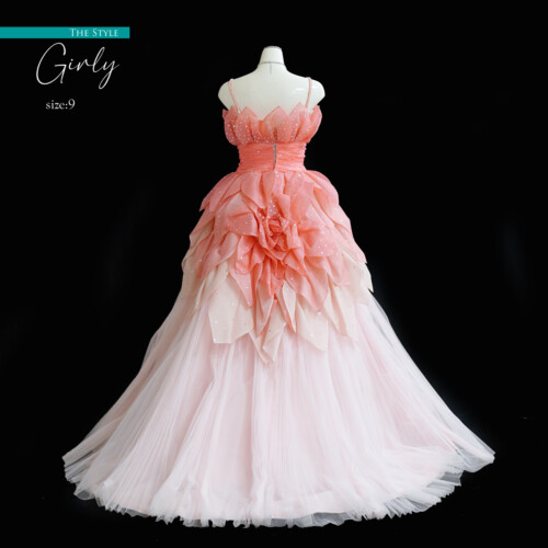 ドレスそのものを花に見立てて花びらに模ったパーツを一枚一枚と重なり合わせて仕上げたフェミニンなドレス。見頃からスカートにかけてグラデーションがおしゃれ感をアップ。バッスルに大輪の花のようにみせたデザインは後ろ姿を華麗に演出。