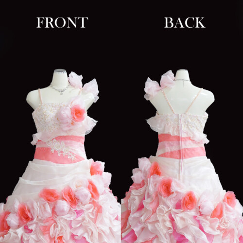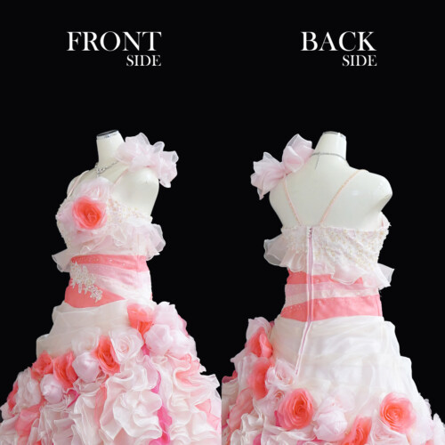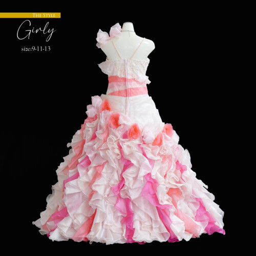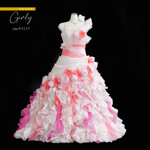 ピンクを基調にした、ミックスカラーにキャンディーのような甘い色合い。ふんわりと広がった縦フリル、艶やかでキュートな印象を感じさます。