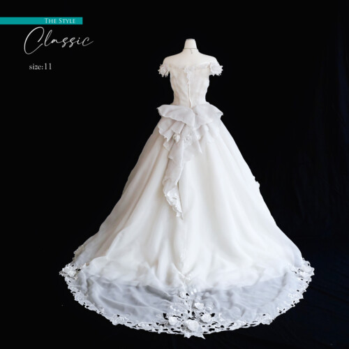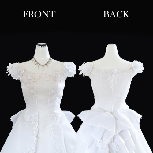 オフショルダーの肩先からスカートに流れるラインに立体的なシフォン素材がフェアリー感を強調されたデザイン。柔らかなシフォンスカートがふんわりと優しさを感じます。