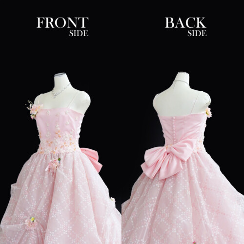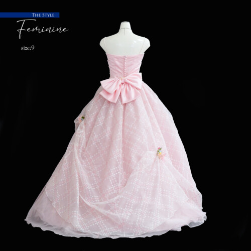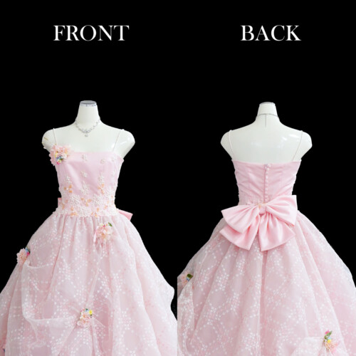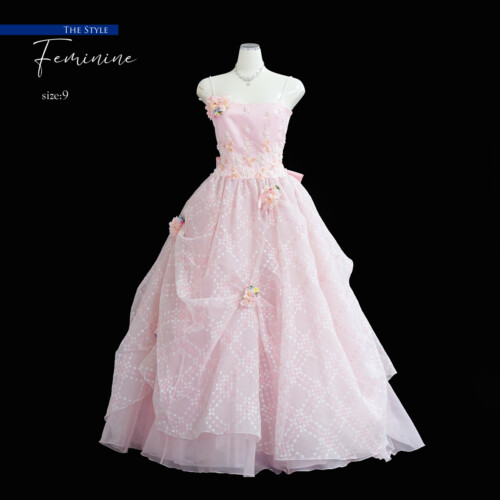 ロマンチックを突き詰めて繊細な刺繍レースを使用したピンクドレス、の甘い着こなしに夢が膨らみます。胸元とスカートに花のコサージュが飾られており華やかさがアップ。