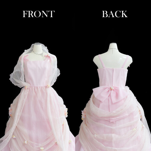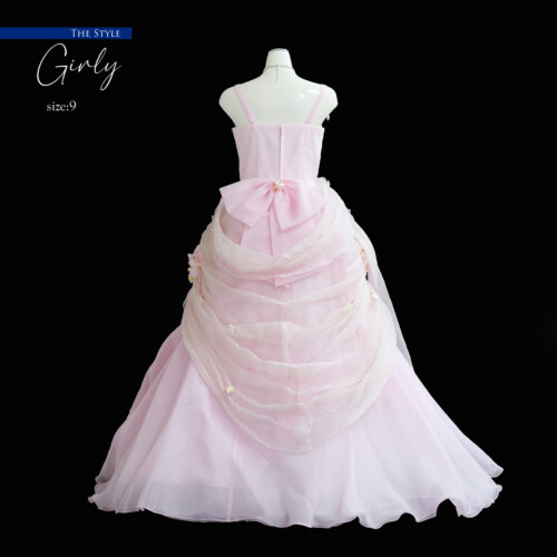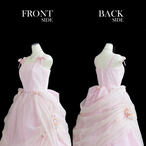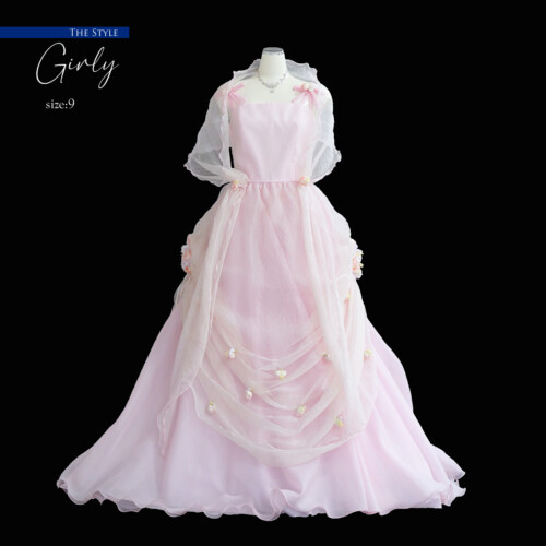 淡いピンクのチュール素材をドレープに優しいラインを施したエアリー感感じされた一着。花のコサージュは取り外すこともできるのでお好きな位置に付け替え可能。