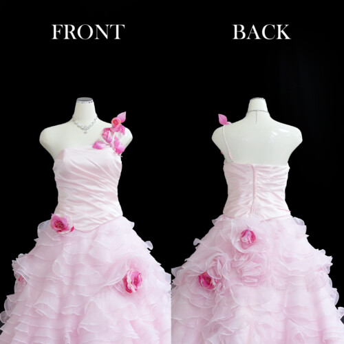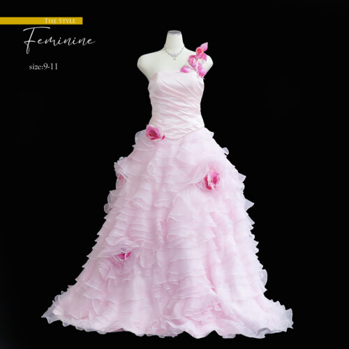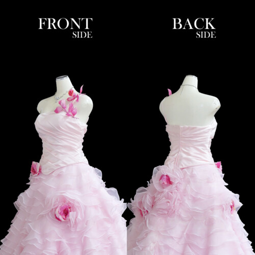淡いピンクのライトカラー、幸せの印象させる人気の色味のビスチェタイプのドレス。ミルフィーユのようなフリルをふんわりと重なり合わせ優しいスカートラインを感じます。グラデーションカラーのコサージュが可愛さをブラスします。
