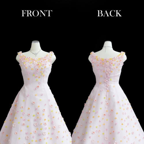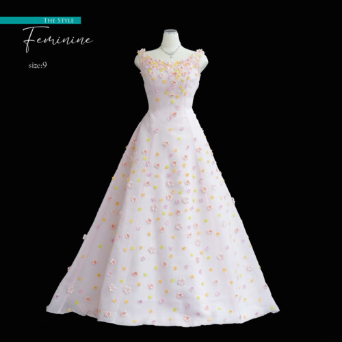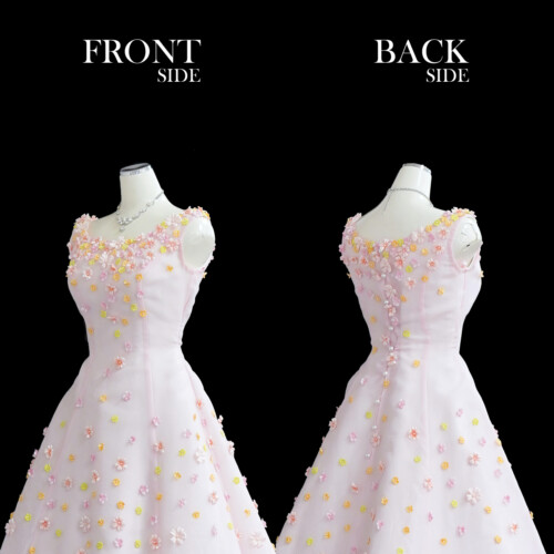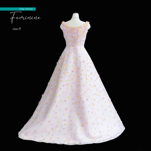 白いアンダードレスに淡いピンクチュールを被せ柔らかな色合いを表現してます。ドレス全体に散りばめられた小花が可愛い花嫁を演出。