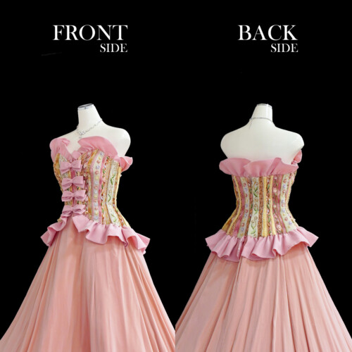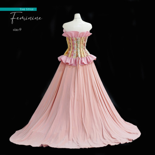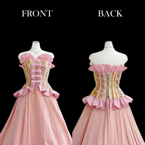 繊細な刺繡を施した上見頃は宝石をつりばめたような華やかさ。スカート部分には深みのあるベルベットを贅沢に使用し、クラシカルな雰囲気を演出。