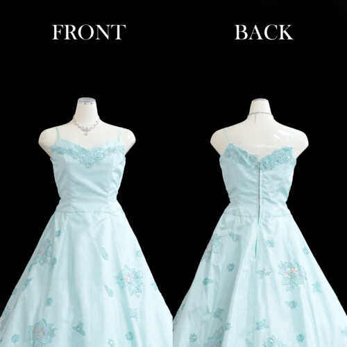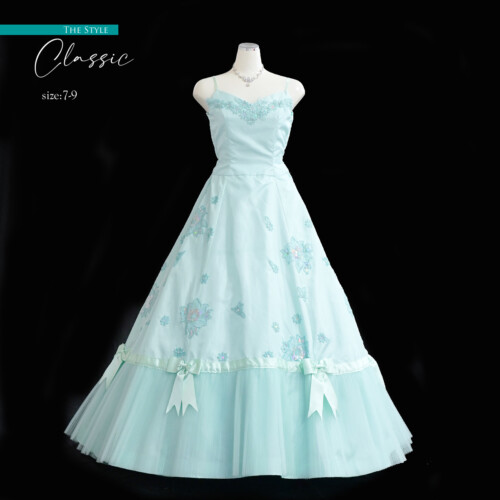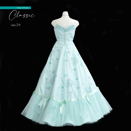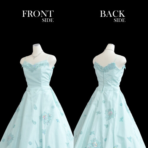 ドレス全体に散りばめられた小花が可愛いらしさを感じます。スカート裾部分に細かいアコーディオンフリルが歩くたび軽やか広がり、優雅な表現を演出。