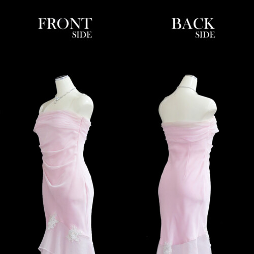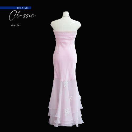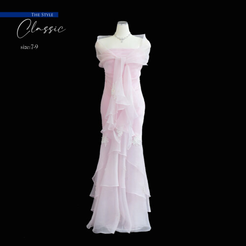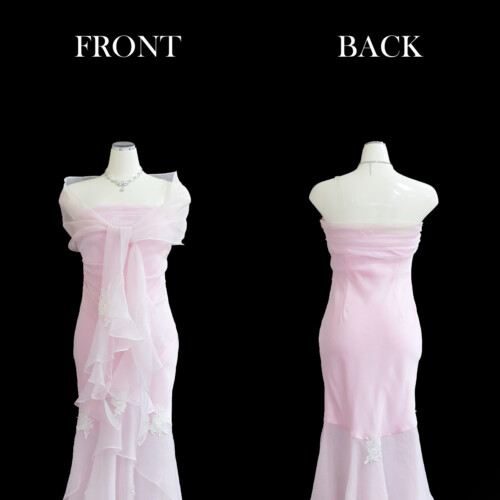 無駄のないシンプルなデザインが美しいマーメイドラインシルエットを際立たせ、優雅なフォルムを感じさせる。スカート部分の透け感がより女性らしい魅力のポイント。