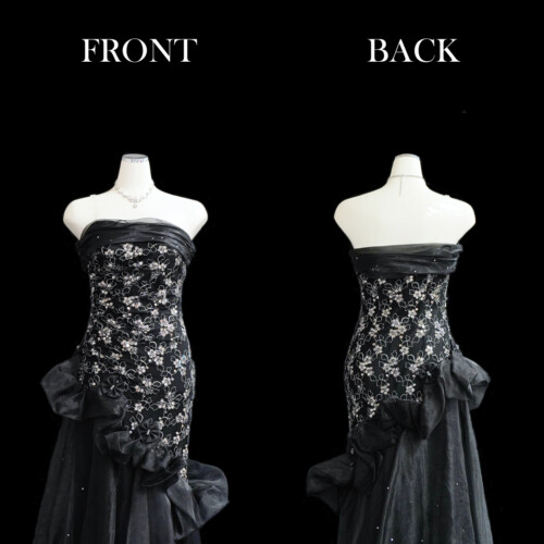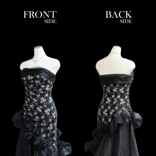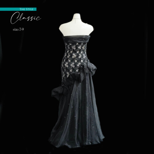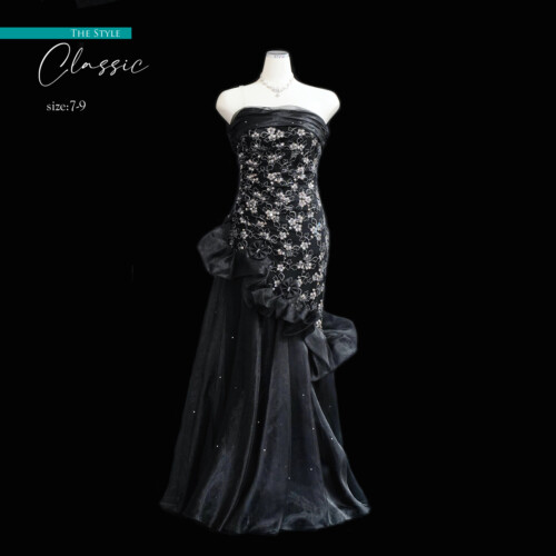流れるようなシルエットが大人の気品と美しさを引き立てる一着。深みのあるブラックにシルバースパンコールが高級感を演出しドラマチックな魅力を与えます。