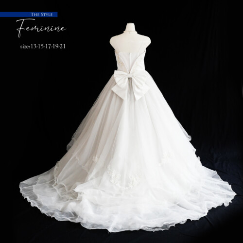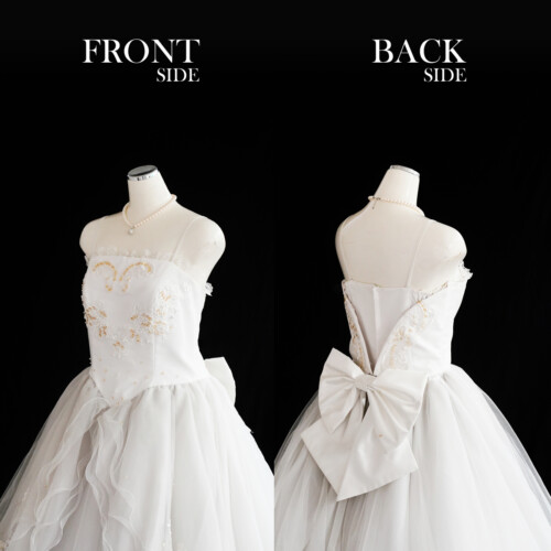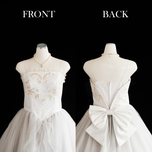 上見頃の調お整が可能なドレス。段々フリルがふんわりと包む柔らかさを感じます。